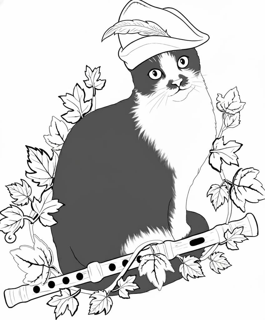 • Piper, The Story Teller: The Master of the Hollow is a small, elegant tuxedo cat with striking big green eyes. You can almost always find Piper perched on a mossy stone, weaving melodies and tales of the Hollow’s hidden magic. She sets the tone for the entire community. What colors will you use to draw in her mossy stone perch feel extra cozy?